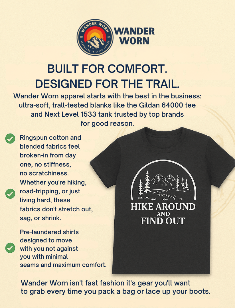 Wander Worn is run by one nature-obsessed human who genuinely loves the outdoors — not a faceless company mass-producing cookie-cutter gear. Each tee is made-to-order, reducing waste and supporting sustainable, mindful practices. We’re here for the memories, the misadventures, and the friendships — not just the margins.